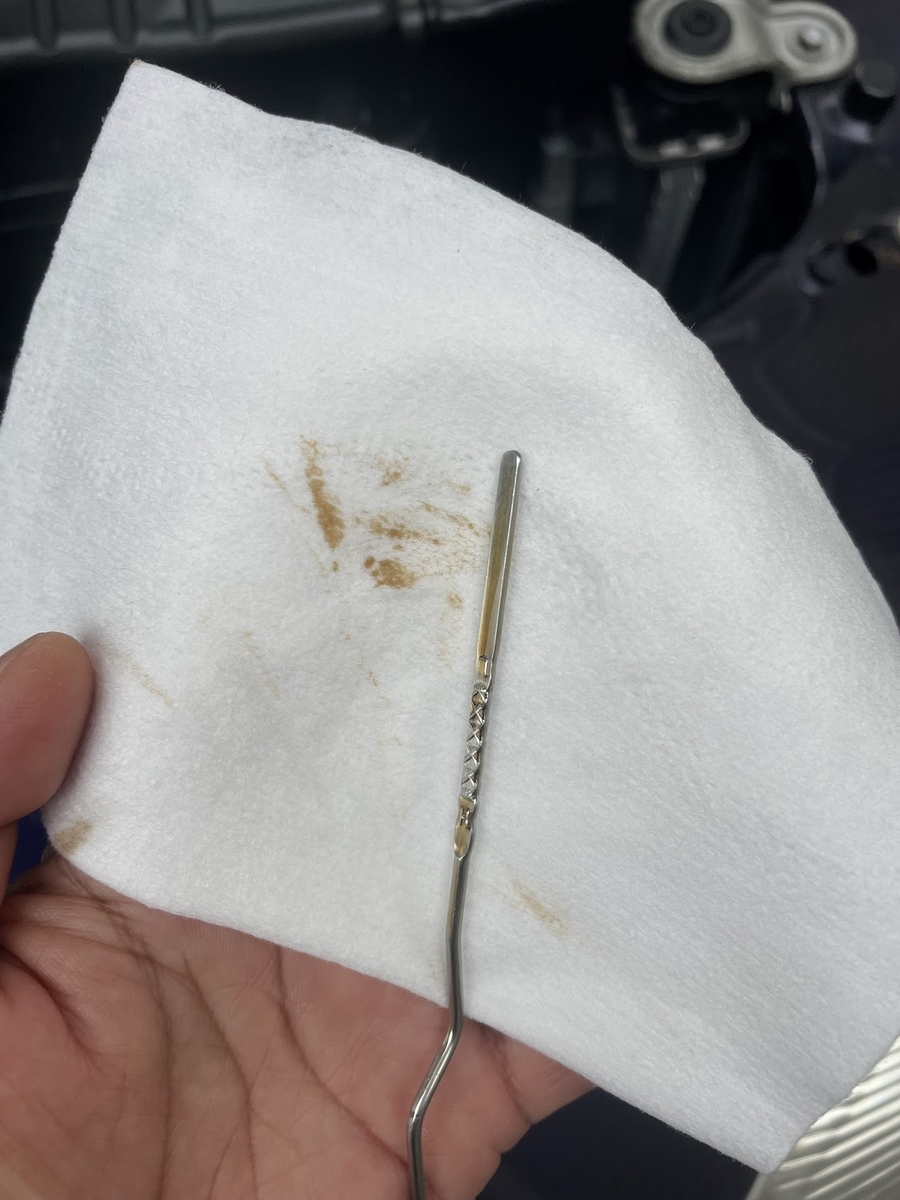 交換前にオイルの状態を確認します。オイルの汚れ具合ですが3,0000kmではこんなものでしょうか。アトレーと比べてだいぶ綺麗なように思えました。